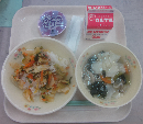 豚キムチ丼、牛乳、ワンタンスープ、ぶどうゼリー