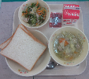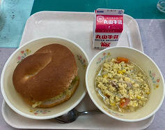 照り焼きチキンバーガー、牛乳、ふわふわスープ