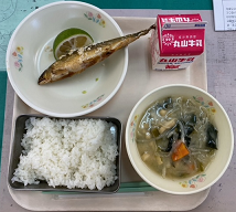ごはん、牛乳、鮎の塩焼き、かぼす、千切大根のみそ汁