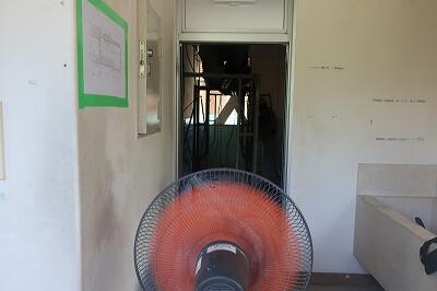 暑い中での作業となります。大きな扇風機を使って作業されています。