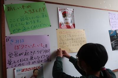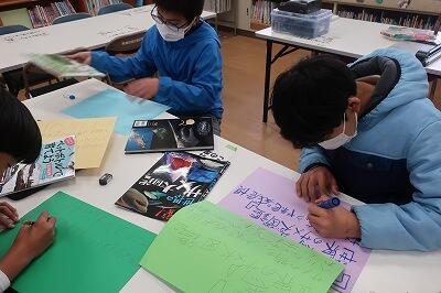 6日(月)の委員会活動では、図書委員会で新刊図書の紹介ポップを作成し、図書掲示板に掲示しました。