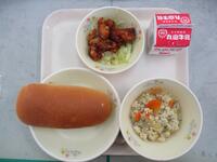 コッペパン 牛乳 ふわふわスープ ヤンニョムチキン 添えキャベツ