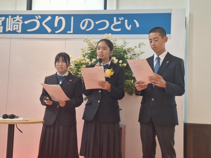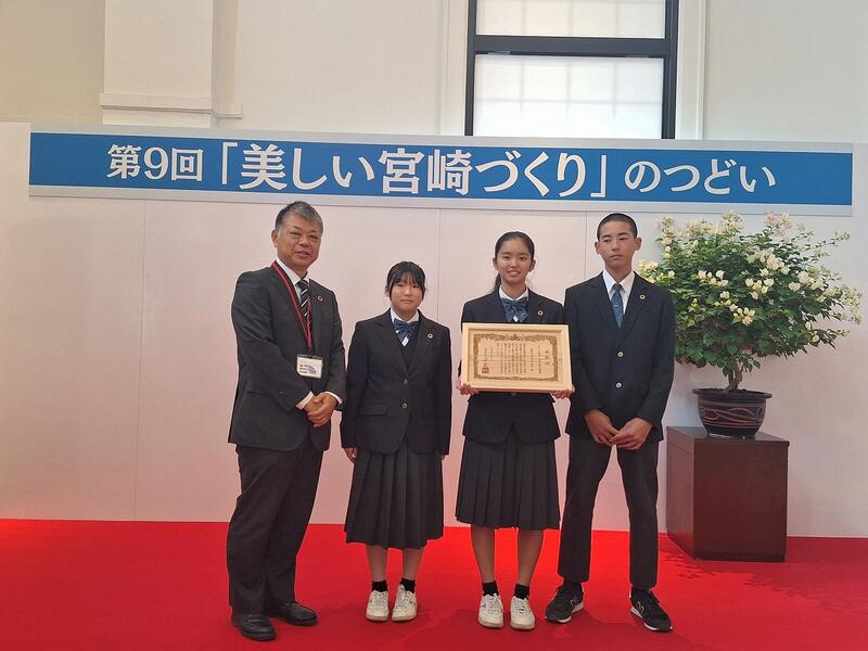 11月2日(日)に「美しい宮崎づくり」のつどいに生徒会執行部の3人で参加してきました。その中で、北川中学校の長年の家田湿原ボランティアと小中クリーン作戦の取組が評価され、水と緑の景観賞の表彰を受けました。その様子をお伝えします。