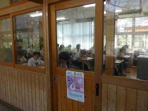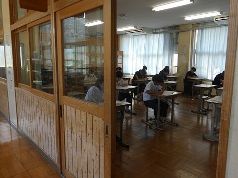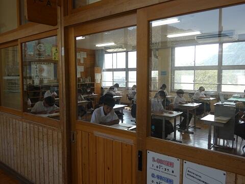 テスト中だったので廊下から生徒達の様子を撮影しました。生徒の様子もいろいろで、前のめりになって鉛筆を動かす生徒もいれば、鉛筆を机に置いて腕を組み、落ち着き払ったようにテストを読み込む生徒もいました。それぞれの生徒が自分なりに頑張っていました。