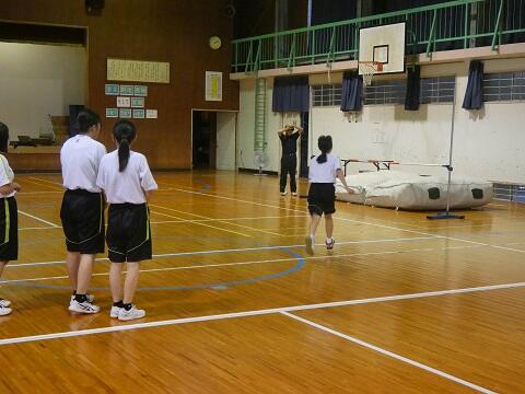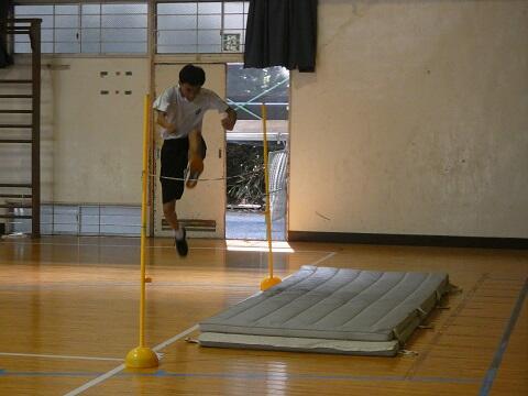 1年生は体育の授業で、体育館で高跳びの練習をしていました。それぞれで跳べそうな高さにチャレンジしていました。