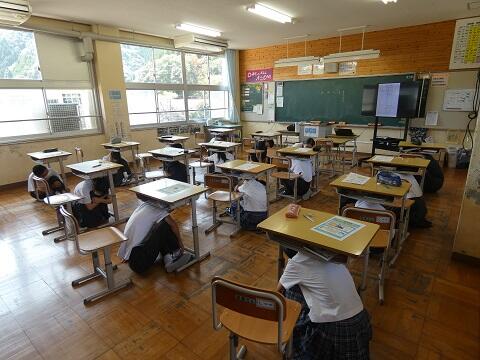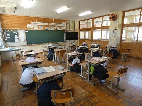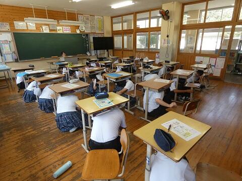 今日の4時間目に避難訓練を行いました。生徒が教室で待機した状態で、放送で緊急地震速報を流しました。生徒達は机の下に入り、落下物から身を守る姿勢をとることができました。