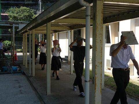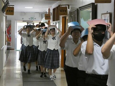 その後は、頭を教科書やカバンで守りながら武道場まで避難する練習を行いました。お喋りもなく静かに移動できていました。