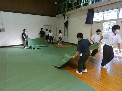 まず最初に緑のシートを引きます。シートは体育館の端から端までの長さなので、とても重たいです。みんなで協力してシートを敷いてくれました。