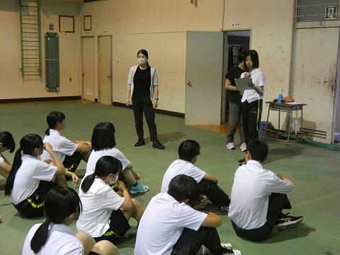 また後半では、実際に体育館でストレスマネジメントのレクリエーションをしました。大盛り上がりで生徒の気分もリフレッシュされました! 講師は「よのなか先生」の林田玲奈さんです。