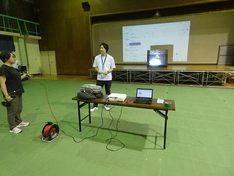明日使う機材が正常に動くかチェックしています。プロジェクターを使ってスライドや動画など様々な発表があります。是非見に来てください。