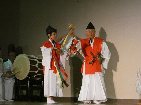 まず開会式での神楽です。太鼓や笛の音色と共に川坂神楽保存会の方たちに踊っていただきました。踊っている姿に迫力があり、非常に荘厳な雰囲気で気が引き締まる思いでした。