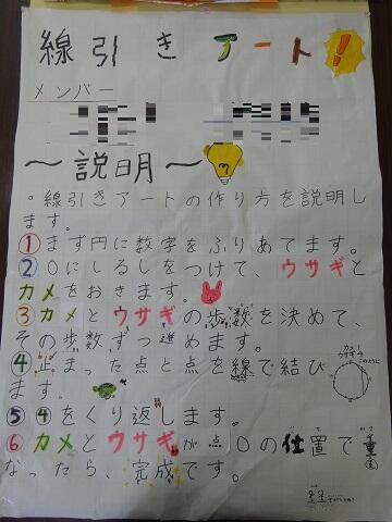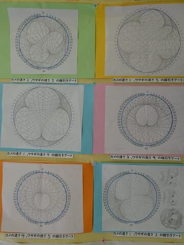 「線引きアート」とは、シンプルな法則で直線を引くだけで、不思議な幾何学模様がでてくる数学のアートです。探究学習では、どのような幾何学模様が出てくるのか研究しました。実際に書いてみたところ、ハート型、ダルマ型、クローバー型、ミッキーマウス型などが見つかりました!ただ直線を引く作業ですが、1枚の絵に120本の線を引いています!他にもいろいろな形がありそうなので、皆さんも是非やってみてください!