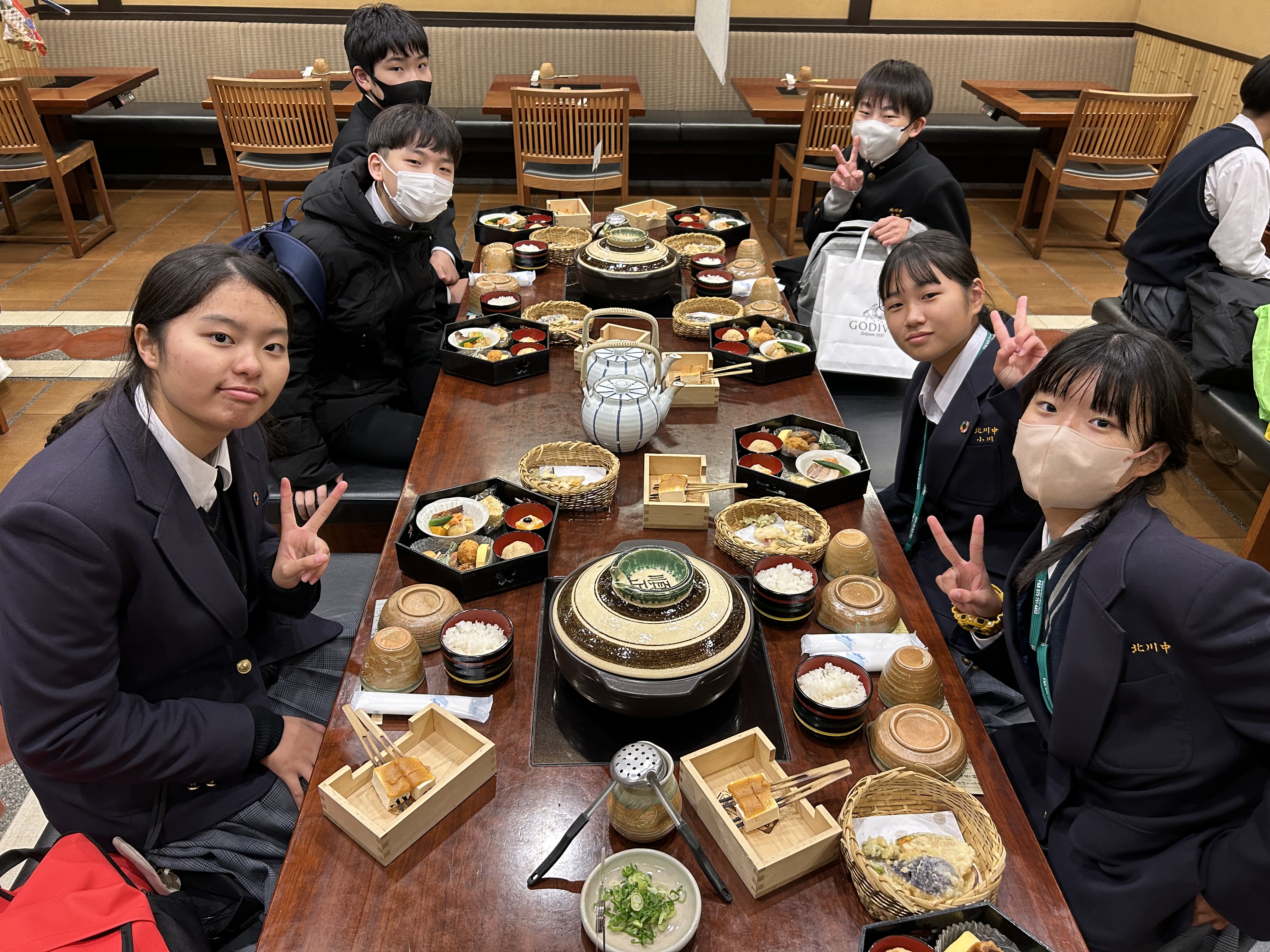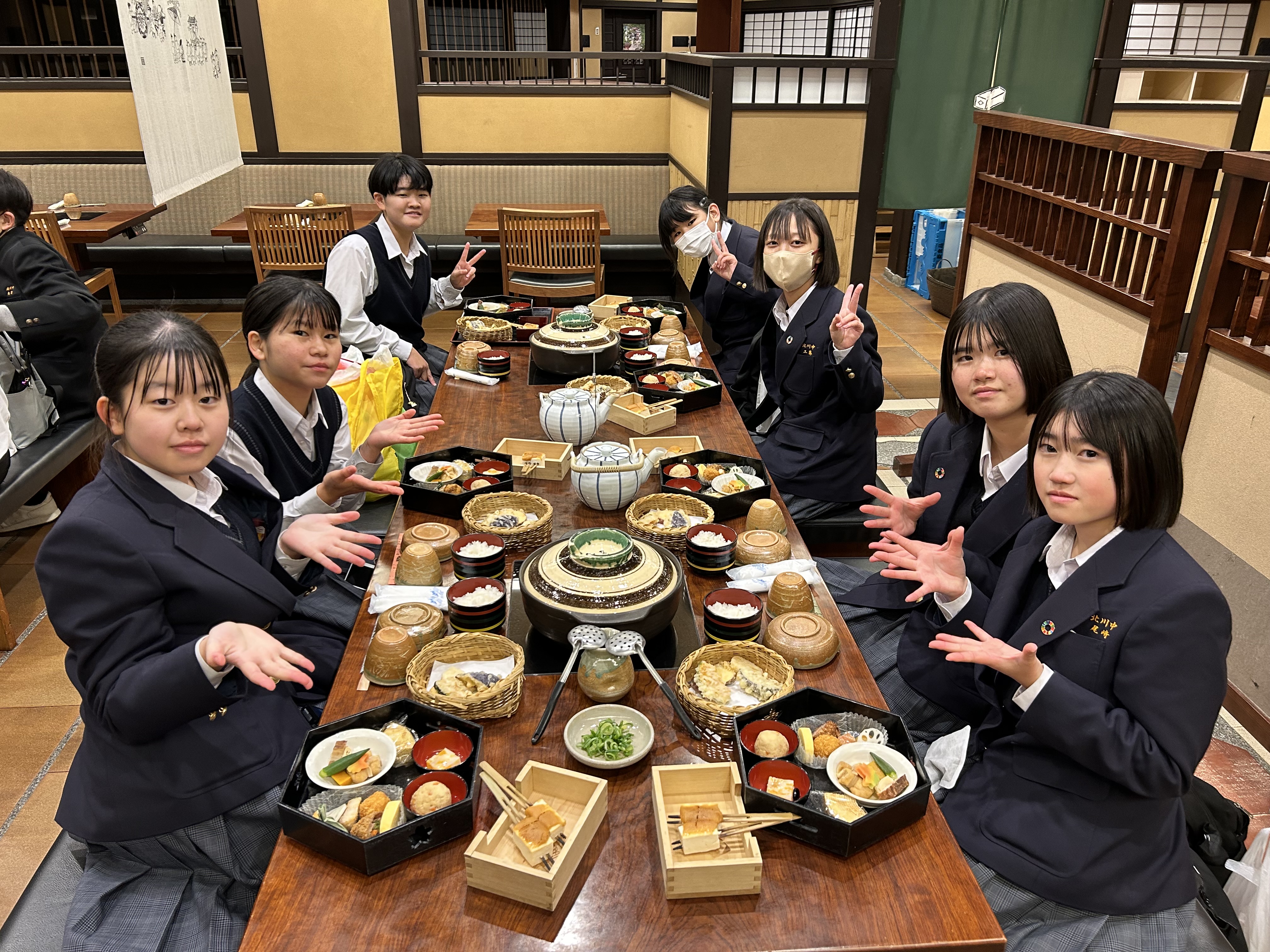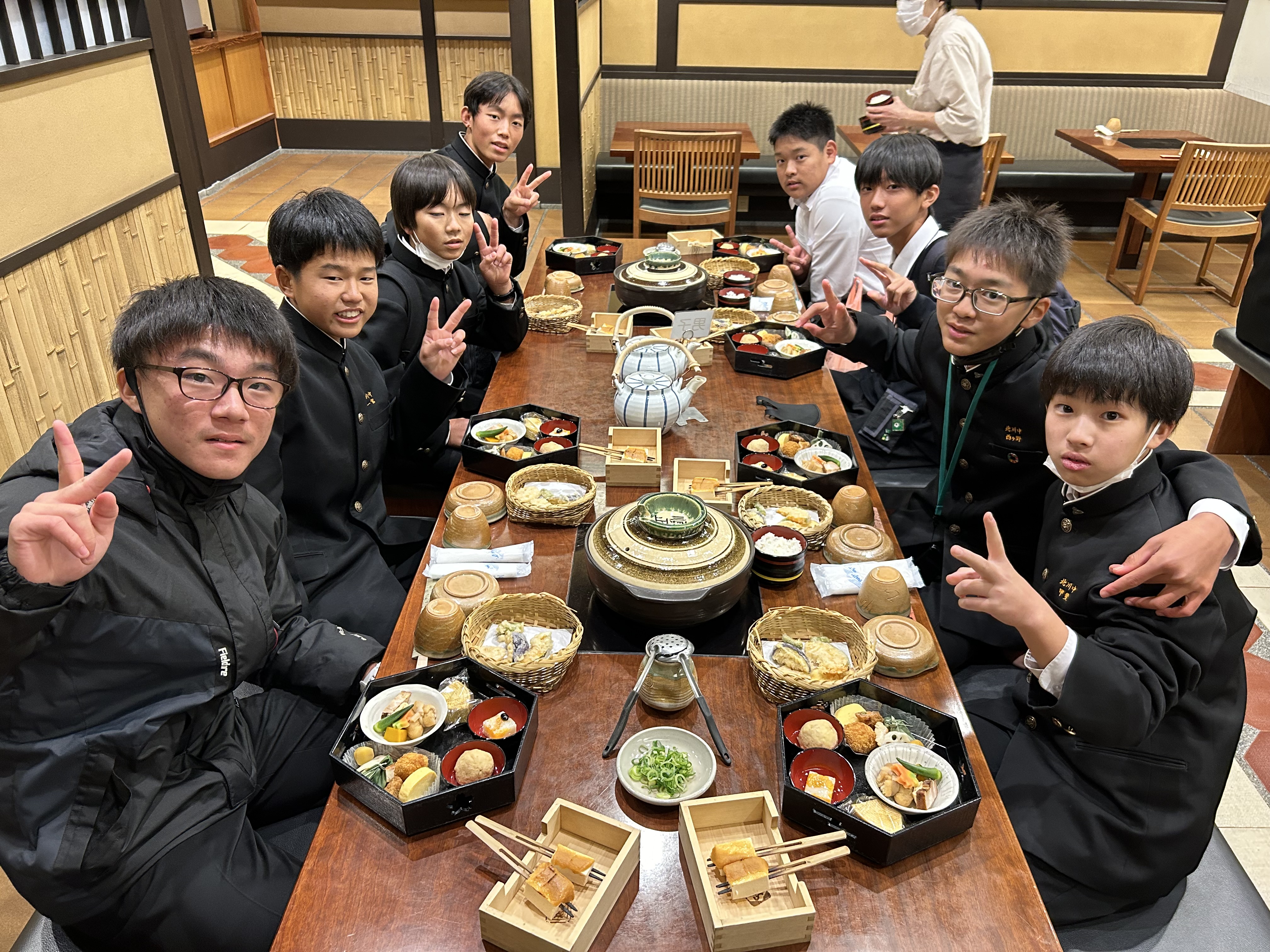 たくさん歩き回って疲れた中、夕食会場に到着しました。夕食は「 清水順正 おかべ家 」です。ここでは京都の伝統的な湯豆腐や湯葉を使った料理を食べました。豆腐パワーで今日の疲れも一気に吹っ飛びましたね