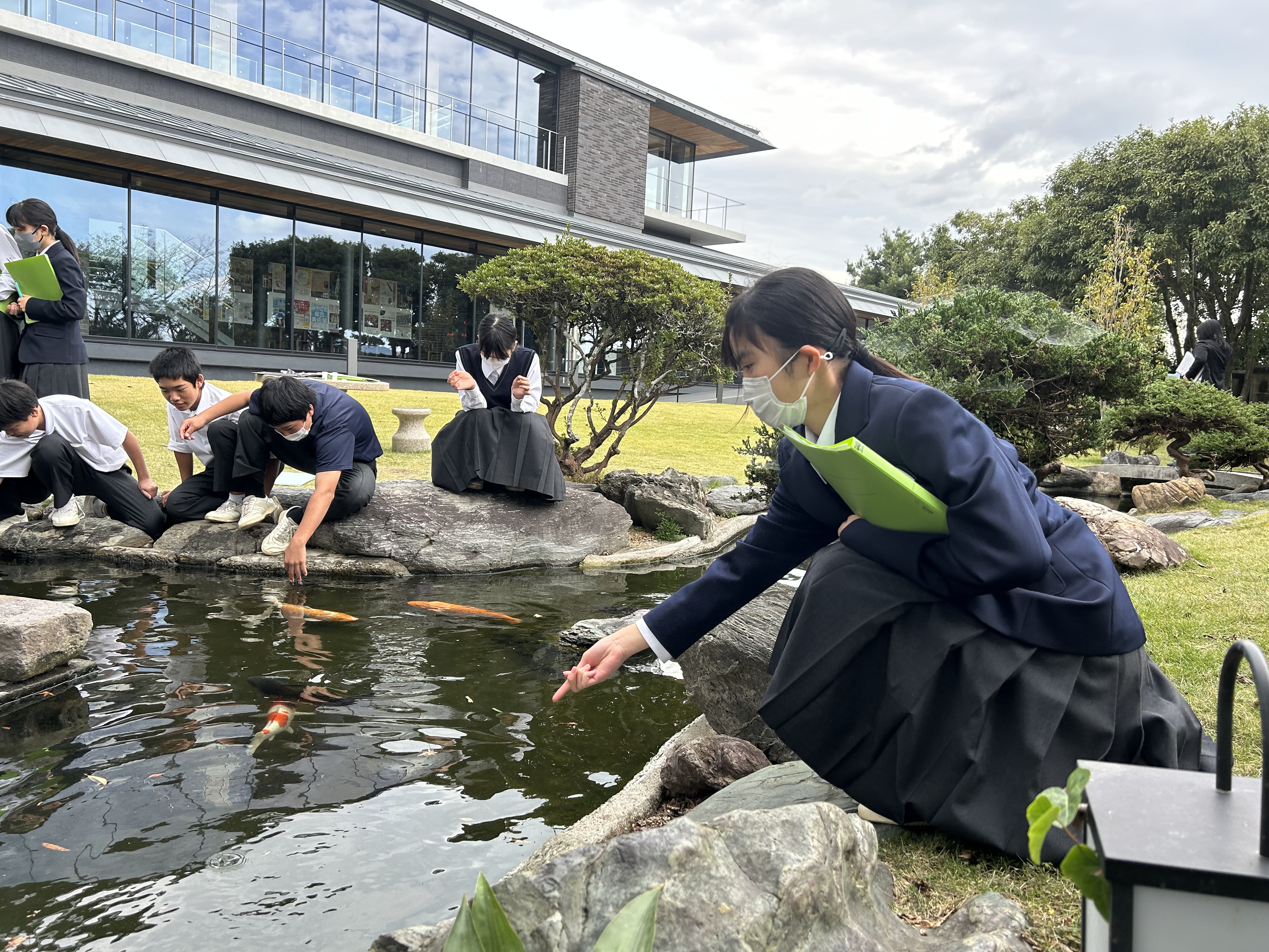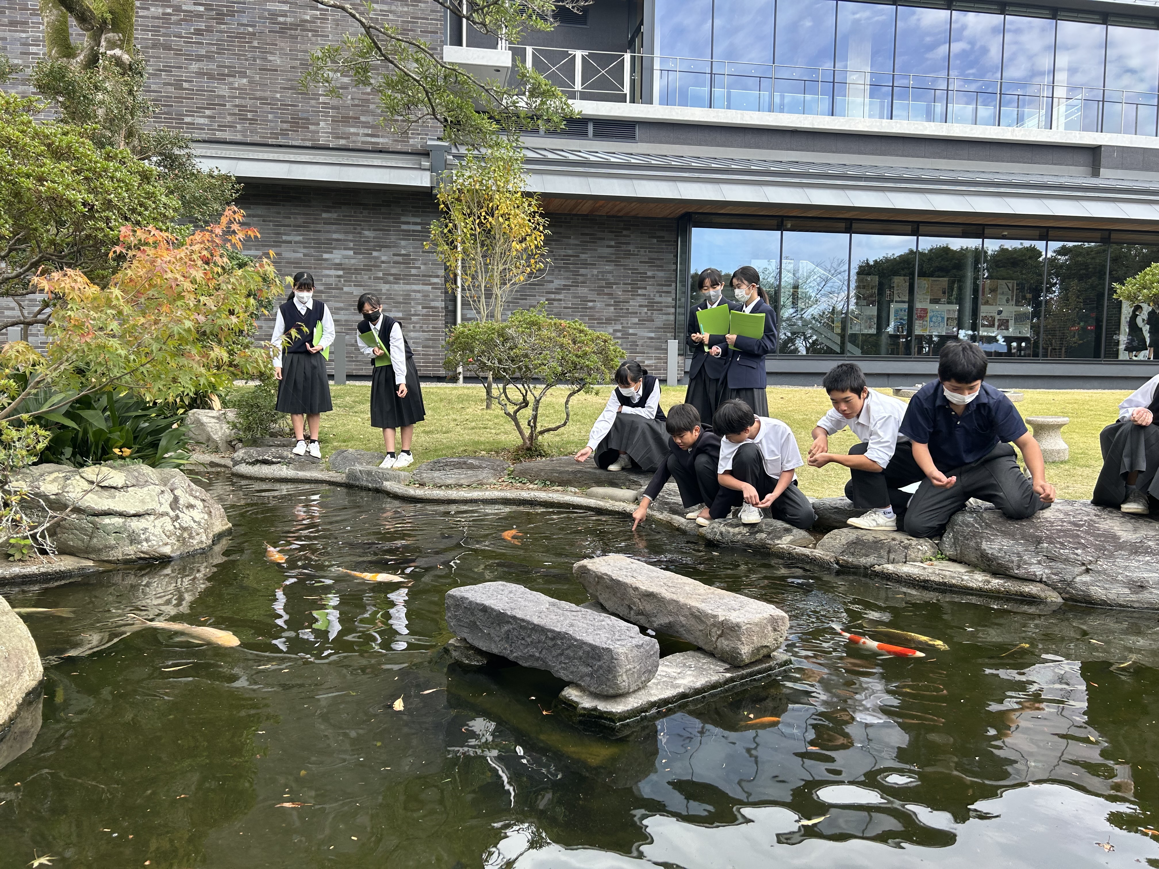 また、庭園内には錦鯉が泳ぐ池や古井戸や内藤家邸宅時代から残された石灯篭もあり、生徒は池の中の錦鯉に夢中でした。