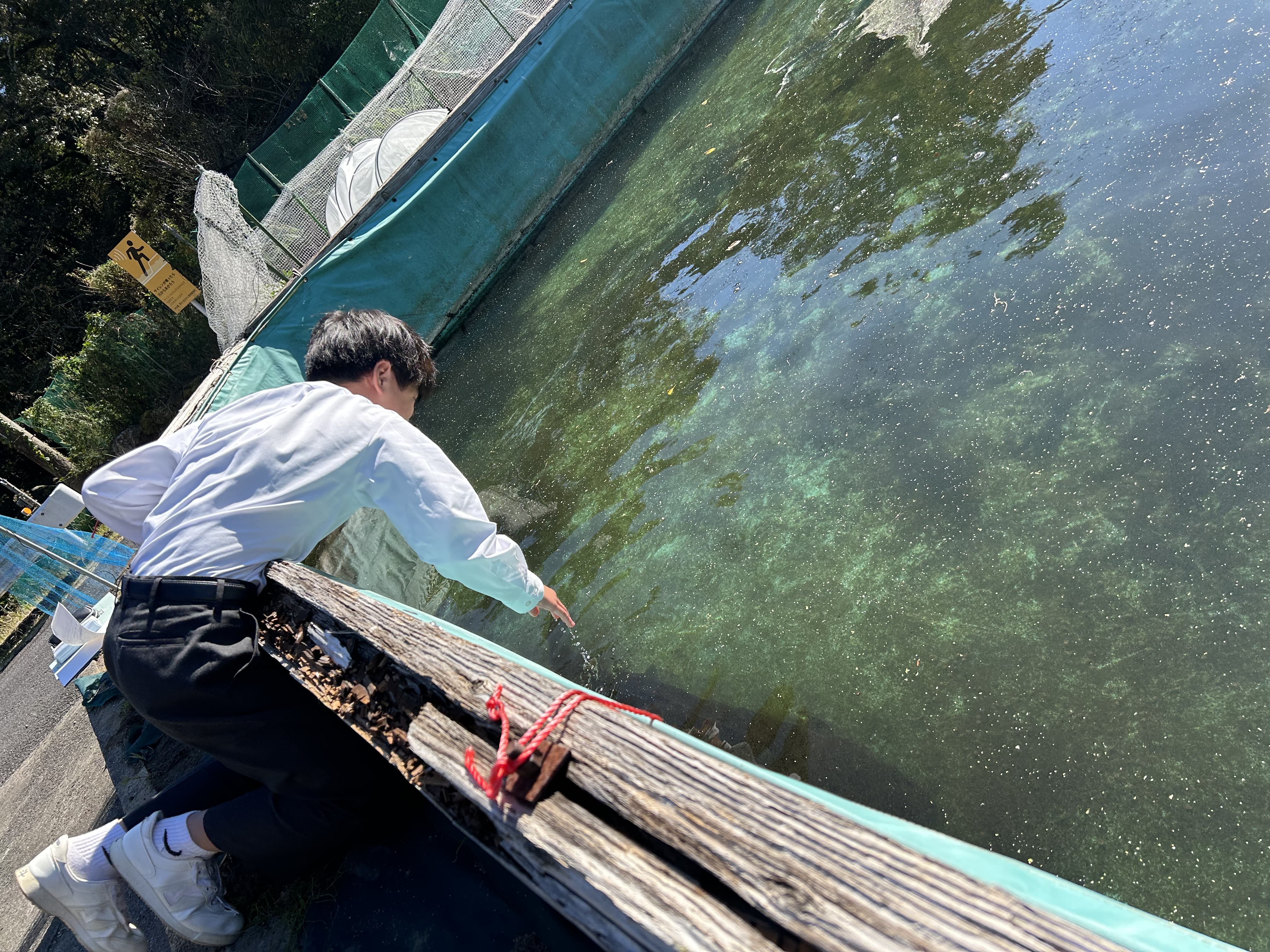 北川でチョウザメを養殖している柴田さんの家へ行きました。様々な種類のチョウザメが養殖されており、実際に触らせてもらいました。