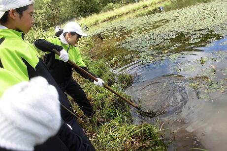 8月27日(日)家田湿原で藻の清掃活動がありました。このボランティアには家田湿原を守る会のみなさんと北川中生23名が参加しました。