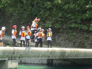 昼食後にインストラクターの指導の下で川へのダイビング体験