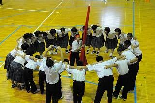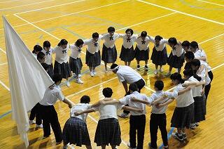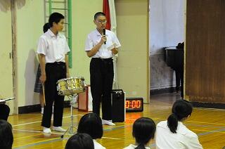 スローガンは友翔(ゆうしょう)です。「友達同士で助け合い、ともに翔けぬけよう」との意味をこめて生徒会執行部で決めました。校長先生から、「体育大会で大事なことは、足が遅い速いの問題ではない、何事に対しても一生懸命に頑張ることに意味があります、役員でもいいですので、自分の出来ることに全力で取り組みましょう。そして、今までにない最高の体育大会にしましょう!」と激励の言葉をいただきました。