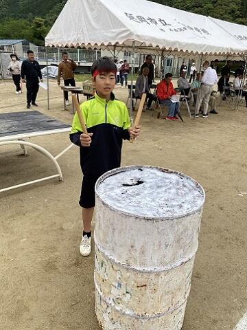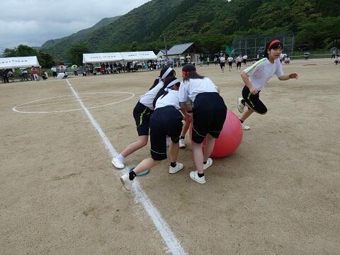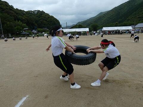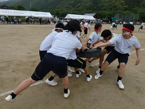 続いて、竹取物語です!グラウンドにならべられたタイヤや竹の棒・サッカーボールなどを自分たちのゾーンまで運べばポイントが入る競技です。普段おとなしい生徒も声を上げてタイヤをつかむ姿が印象的でした!