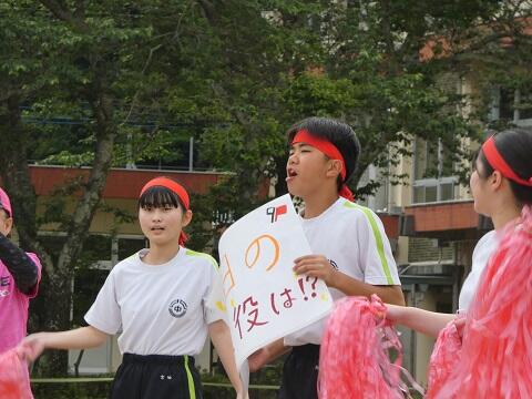 続いて応援合戦です!両団とも個性的な応援をしていました!リーダー達がフリップやボンボンを平日の昼休みや放課後に作っていました。個人的に好きな応援はパイナポーの応援です!両団ともしっかり声が出ていてよかったです!