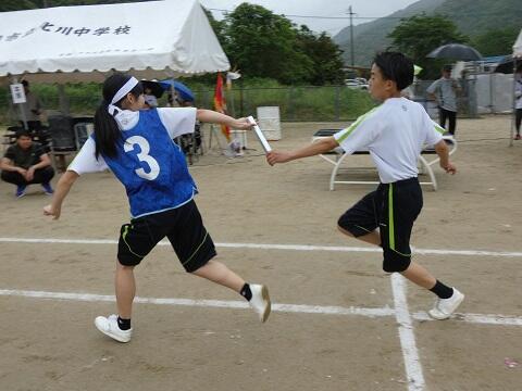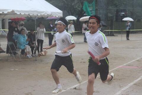 次に全校生徒によるリレーです!体育大会では外せない競技ですね!生徒が一生懸命にバトンをつないで走り、それを見る生徒も一生懸命に声を出していて白熱した戦いでした!
