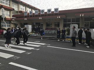 先輩方が靴箱でお出迎え。「おめでとう」の言葉とともに