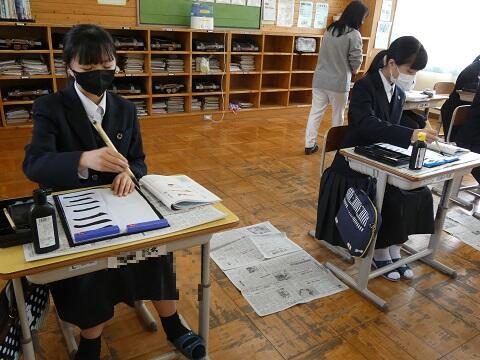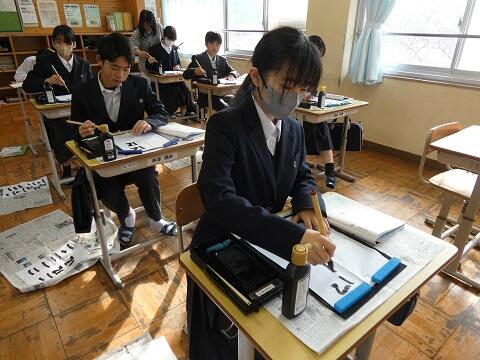 今日の授業では、初めて行書に挑戦します。行書の特徴を捉えて、速く美しく書く練習をしています。