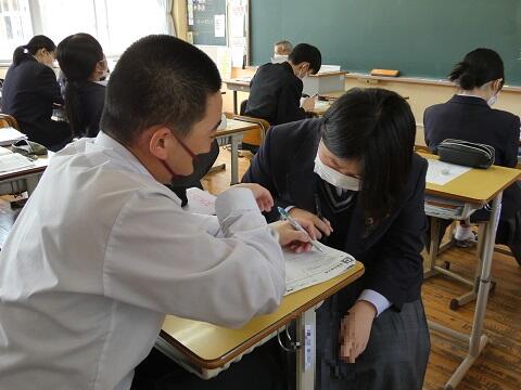 3年生は理科の授業で、プリント学習をしています。お互いに教え合い活動をする生徒や、黙々と問題を解いていく生徒がいました。