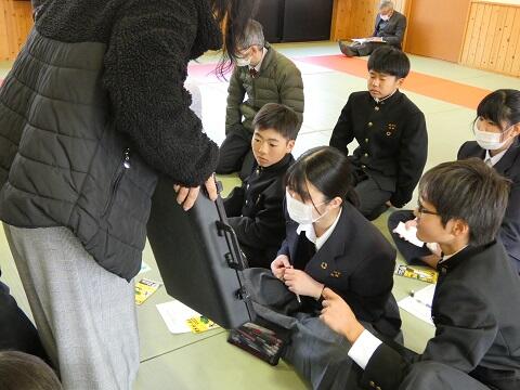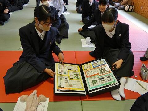 薬剤師の方から、薬物の標本やパンフレットをいただき、薬物の危険性や対処法など学ぶことができました。生徒達は興味津々に「これが何か!」「こんなのなんだ!」と見て学ぶことができました。
