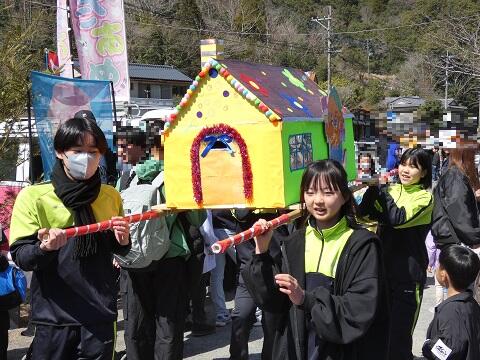 手作り駄菓子のお神輿で駄菓子まきをするよ!