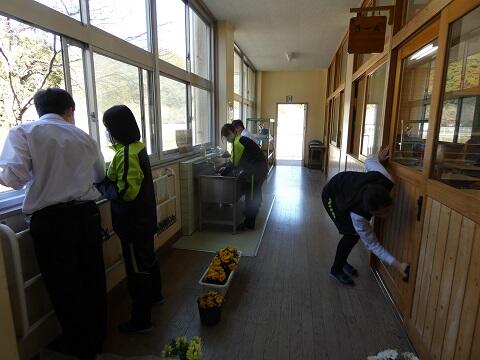 前日準備では、1・2年生が3年生を送るために卒業式の準備をしました。3年生の思い出の詰まった教室や体育館、玄関、廊下、トイレなど隅々まで掃除・飾り付けを頑張りました。