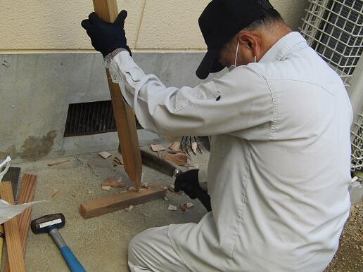 学校技術員である植田さんに「かかしの作り方は分かりますか?」と聞くとすぐに、「わかります。作りますか!」と言ってくださり一緒にかかし作りに取り組んでくださいました。