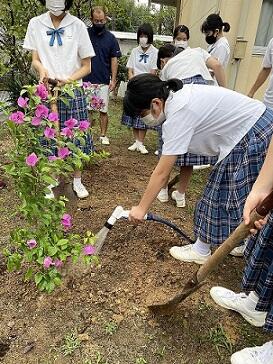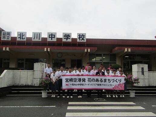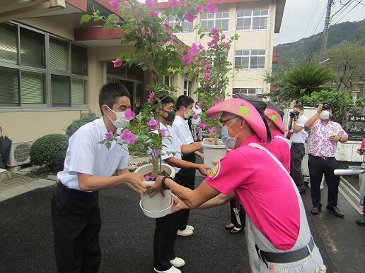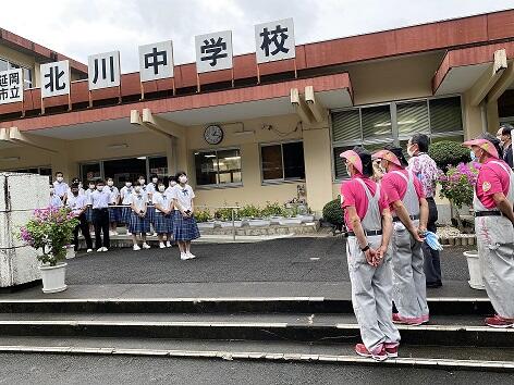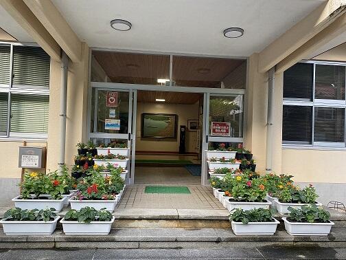 北川中学校に来ると、綺麗な花たちがお出迎えをしてくれます。