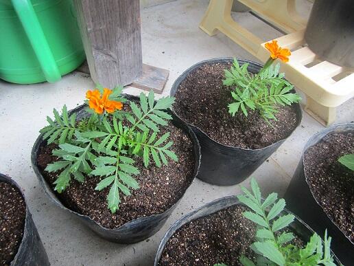 6月中旬、小さなポットに植えた花たちが大きくなると、今度は大きなポットに移します。