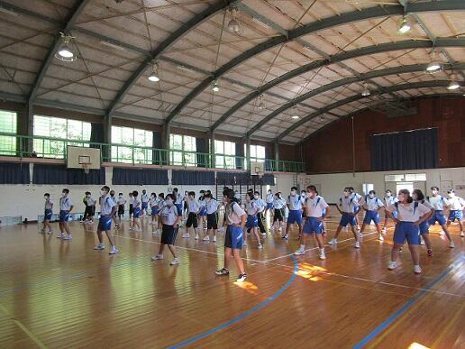 体育館の蒸し暑い中、一生懸命に踊っていました。ダンスが苦手な生徒に3年生やリーダー達が教えている姿が見られ,ダンスの完成がとても楽しみです!!!