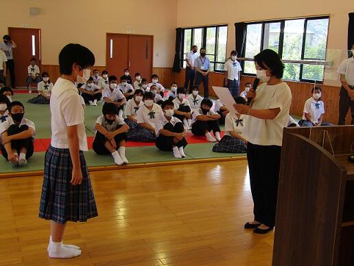 全校集会では、始めに今日から3日間、宮崎産業経営大学からスクールトライアルにこられた2名の大学生の紹介をしました。