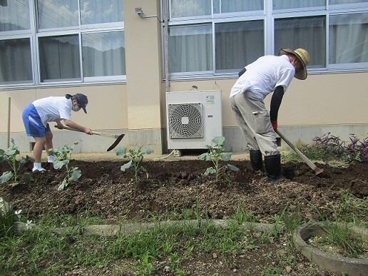 1学期にクワの使い方を教えていただいたので、慣れた手つきで畝作りができました。大きく育つといいです