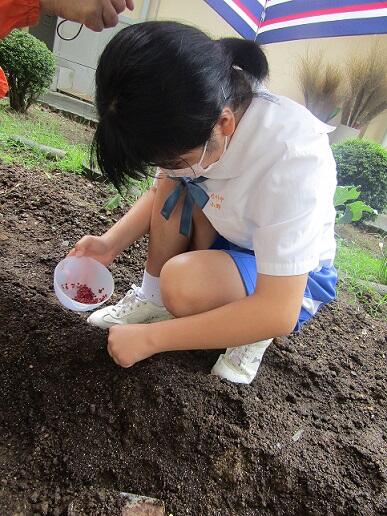 3年B組の作業の時間では、ゴーヤの収穫が終わったため、新たに ”大根” を育て始めました。1学期同様に、学校技術委員の植田さんに協力をしていただき、畝作り・種まきをしました。