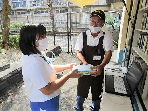 本校職員が生徒代表に渡し、その後全校生徒に配付しました。生徒たちは通学時等の安全対策として、スクールバックに付けて登下校をしています。
