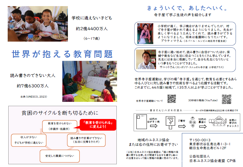 1人でも多くの子ども達を学校へ行かせ、学びの場を設ける取組として日本ユネスコ協会連盟が『書きそんじハガキ・キャンペーン』を行っています。
