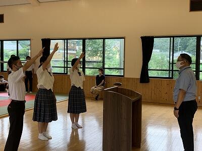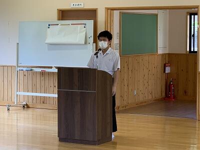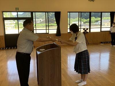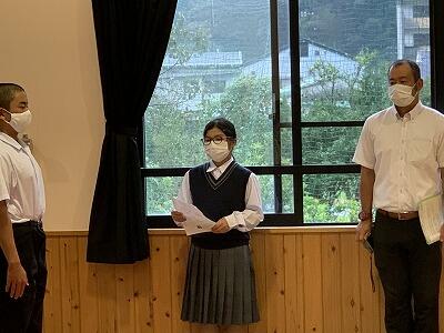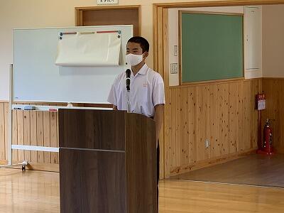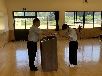 在校生代表の3年矢野君と校長先生から激励の言葉をもらいました。