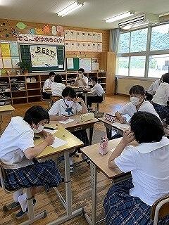 自然災害発生時の学校周辺、自宅周辺を想像して対策を立てたり、大雨によって北川が氾濫した場合の自分の行動を考えたりと、生活に密着した学習課題が設定されていました。生徒も一生懸命取り組んでいました。