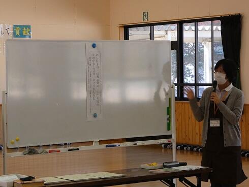 始めに、絵本「おむすびさんたちのたうえのひ」の読み聞かせをしました。読み聞かせが終わった後、絵本の中の登場人物を読み取るクイズをしました。生徒たちは口々に「たまごさんいたっけ?」「たこどんは絶対いた!」などと楽しんでいる様子がうかがえました!
