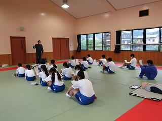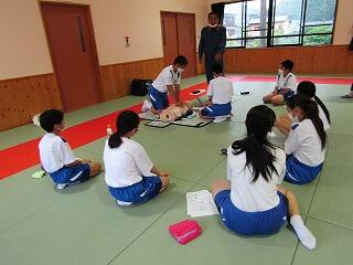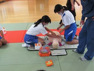 5.6校時に、消防署から2名の講師に来ていただいて、第1学年でAED講習を行いました。説明のあと、実際に「心肺蘇生法」や「AEDの使い方」を学習しました。みんな真剣に取り組んでいました。