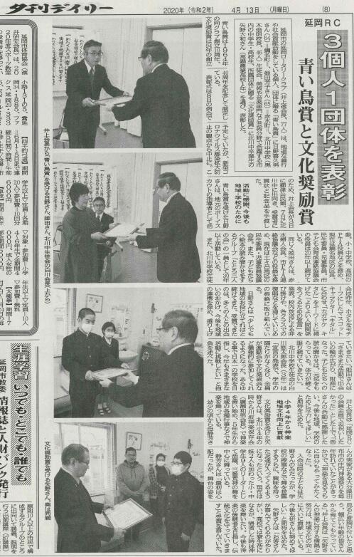 ロータリークラブ青い鳥賞・文化奨励賞の表彰が、先日北川中学校校長室にて行われました。