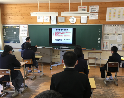 担当の先生の放送に合わせて、プレゼン資料を各教室で見ながら話を聞きました。