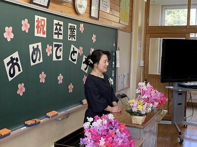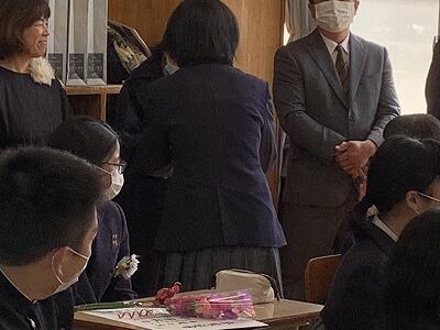 3年生担当の先生からメッセージが贈られ、生徒からは花や色紙が贈られました。