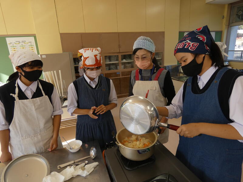 25日の金曜日に1年生は調理実習を行いました。1年生が作った料理は「シチュー」です。寒い季節にはどの家庭でも鍋やシチューといった温かい料理が多く出るのではないでしょうか?冬に心も体もぽかぽかになる料理はどのように作るのか?1年生は調理実習で学ぶことができました。