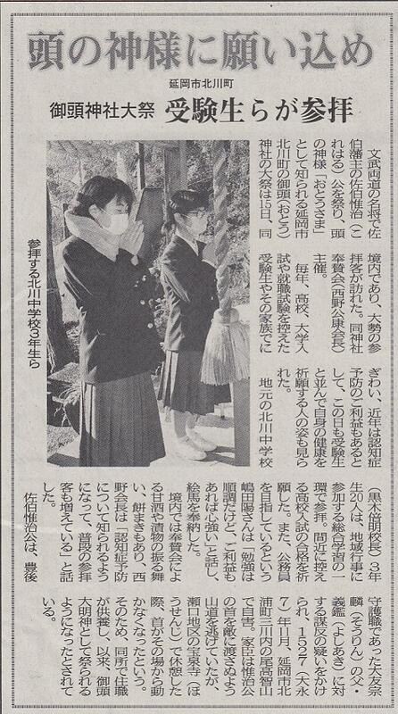 地域の方々から「受験頑張って」、「大きくなったね」と声をかけられ、餅と縁起物の五円玉も全員いただき、温かいおもてなしをしていただきました。(新聞社、ケーブルテレビも祭りの様子を取材されていました。)