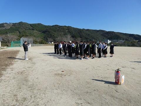 予定では生徒も消火器を使う練習するはずでしたが、強風のため、職員が代表で消火器の実演をしました。火事を見つけたときは